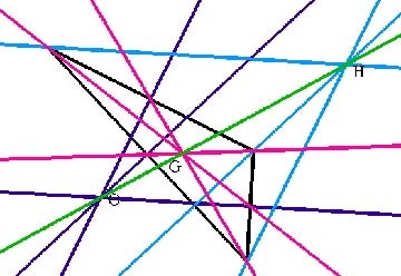 Les droites bleu représentes les hauteurs du triangle. Elles se coupent en un point H. H est appelé l'orthocentre du triangle.